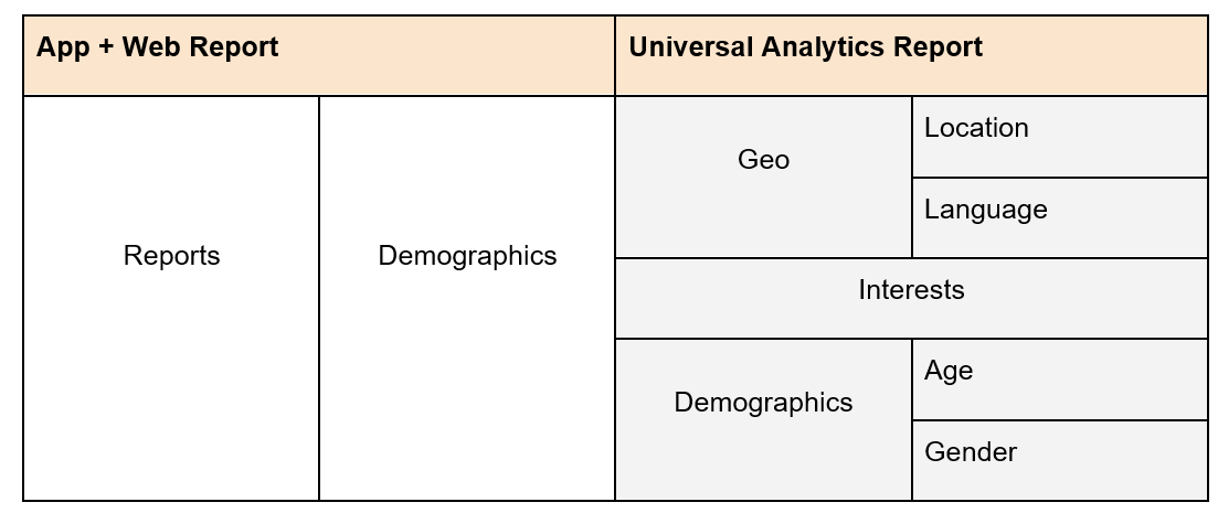 In het demographics-rapport in App + Web zijn een aantal rapporten die we kennen uit UA samengevoegd. Zo zijn de afzonderlijke demografische-, geografische- en interesse-rapporten van UA allemaal onderverdeeld in het demographics-rapport. De data in dit rapport laten je zien vanaf welke locatie je gebruikers je website of app gebruiken en – op basis van andere Google-databronnen – wat hun taal, leeftijd, geslacht en interessegebieden zijn. Dit rapport is op gebruikersniveau geconfigureerd. Voor de leeftijd-, geslacht-, gender-, taal en interesse data zul je ook in App + Web eerst de advertising features optie moeten aanzetten.