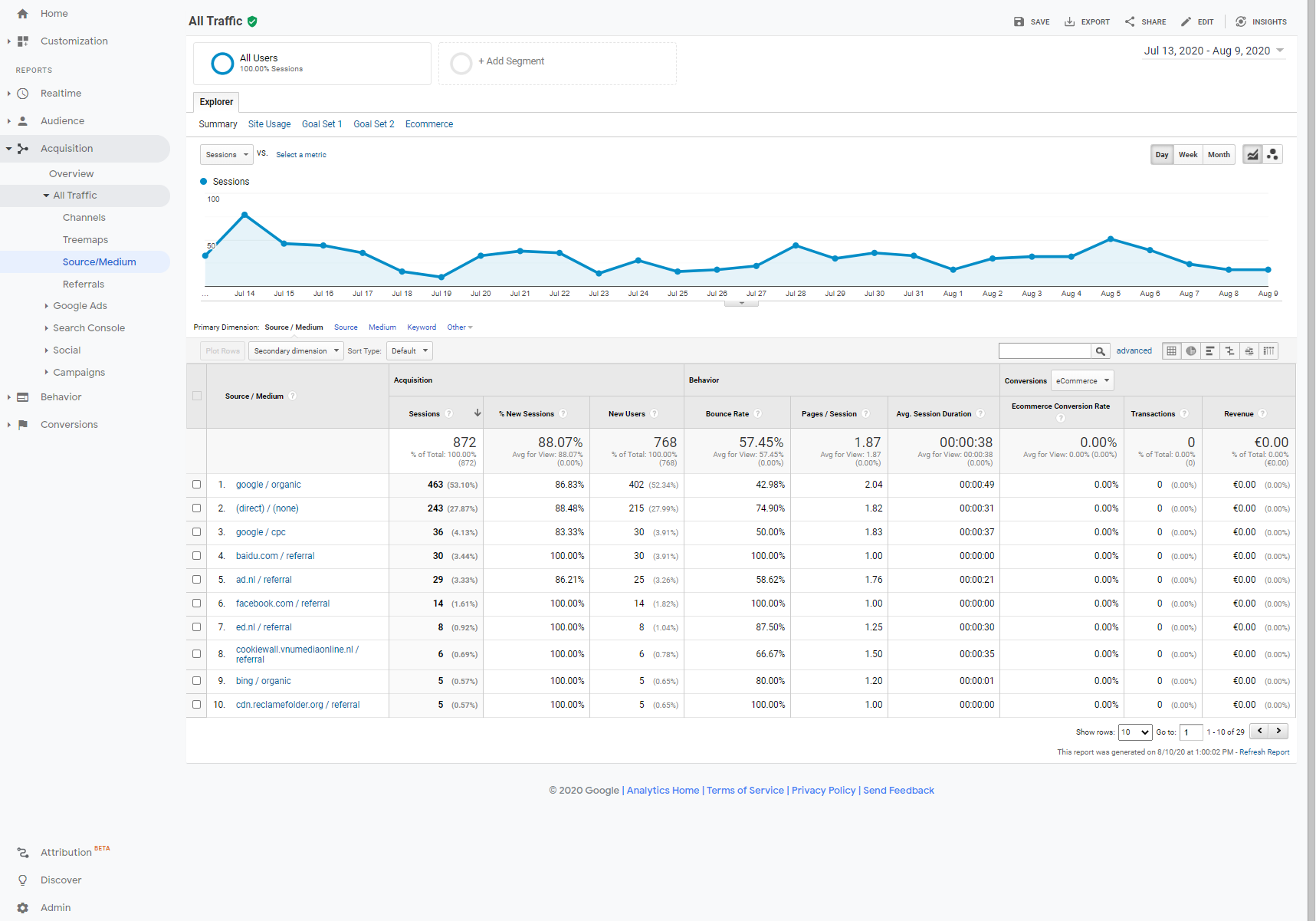 Momenteel is Google Analytics App + Web in bèta. Het is dus waarschijnlijk dat er in de toekomst nieuwe secties en/of rapporten aan de interface toegevoegd gaan worden. Voor dit jaar verwachten we bijvoorbeeld dat de e-commerce rapportages in een bepaalde vorm terug zullen komen. In het vervolg van dit artikel zetten we uiteen hoe de interface binnen App + Web momenteel is opgebouwd, en hoe dit zich verhoudt tot UA.