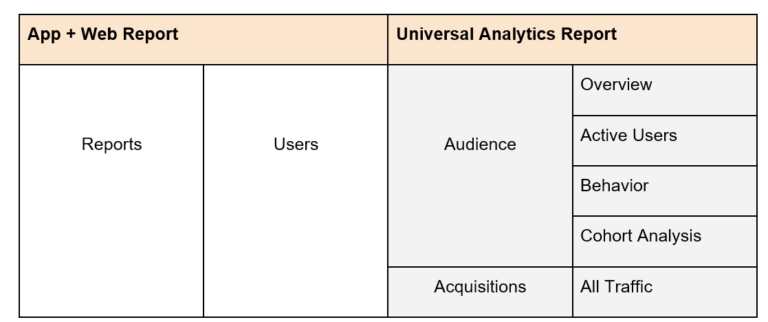 Niet alleen het meetmodel, ook de interface van App + Web is behoorlijk anders dan die van Universal Analytics (gelanceerd in 2012). Wat voornamelijk opvalt aan de nieuwe App + Web-interface is dat die sterk vereenvoudigd is.