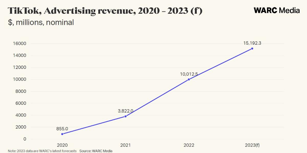 WARC verwacht vertraging op de digitale advertentiemarkt, en TikTok trotseert de trend omdat groei dit jaar doorzet. Volgens de laatste prognose voor advertentie-uitgaven van WARC Media zal TikTok in 2023 £ 15,2 miljard aan advertentie-inkomsten bereiken, een stijging van 51,7% en een upgrade van bijna $ 2 miljard ten opzichte van de prognose van vorig jaar.