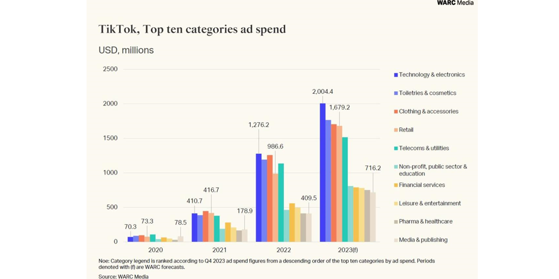 Elk van de top vijf bestedingscategorieën: technologie en elektronica (2 miljard USD), toiletartikelen en cosmetica (1,8 miljard ), detailhandel (1,7 miljard ), kleding en accessoires (1,7 miljard) en telecom en nutsbedrijven (1,5 miljard) zal naar verwachting laten zien dat hun gecombineerde jaarlijkse uitgaven aan TikTok in 2023 de 8,5 miljard USD overschrijden. In andere categorieën zal de groei bescheidener zijn.