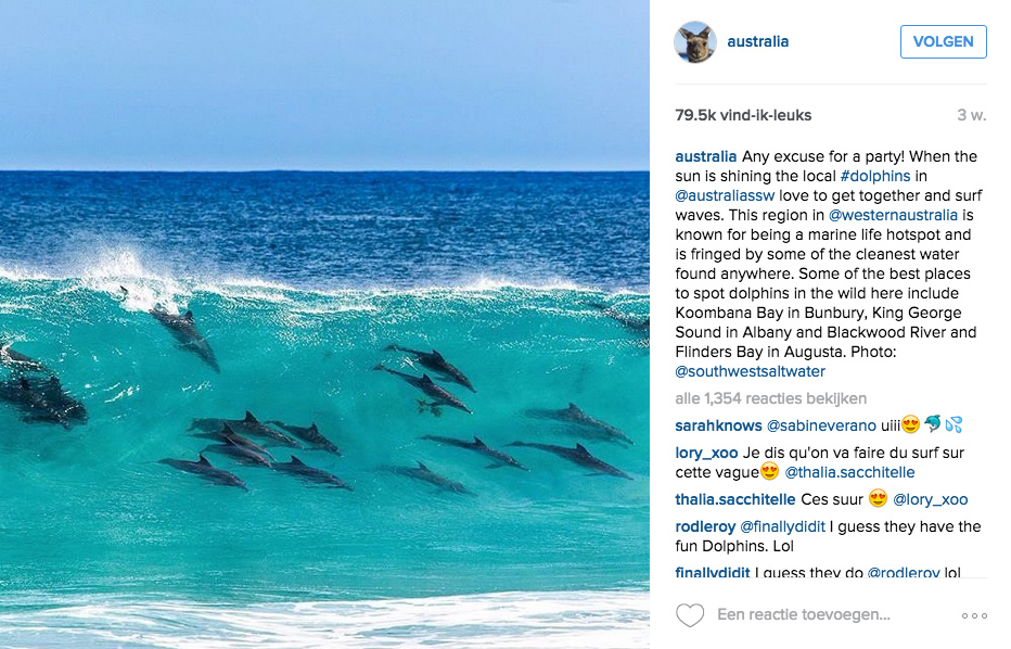 Dat er genoeg mogelijkheden liggen, bewijst niet alleen het aantal berichten met bovenstaande hashtags. Travelnext publiceerde recent een blogpost over hoe het zoeken op plaatsen op Instagram niet alleen fantastisch is voor de gebruiker, maar ook mogelijkheden biedt voor de reisindustrie, waarbij het vooral draait om ‘user generated content’. Iets wat ook Tourism Australia laat zien: onderstaande foto kreeg bijna 80k likes en het account ‘Australia’ heeft 1,7 miljoen volgers.