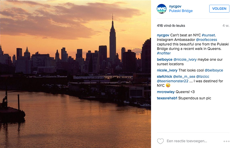 Nycgov is het account van de stad (of het stadsbestuur). Het account heeft 13k volgers en maakt gebruik van een aantal ambassadeurs om diverse foto’s te plaatsen. Zo zien we bijvoorbeeld foto’s van @roofaccess vanaf daken voor mooi uitzicht over de stad. Opvallend is dat de stad zelf vrijwel geen gebruik maakt van #NYC en ook andere hashtags worden weinig gebruikt.