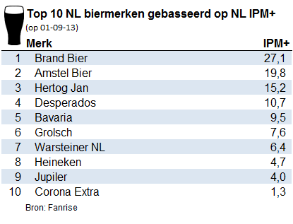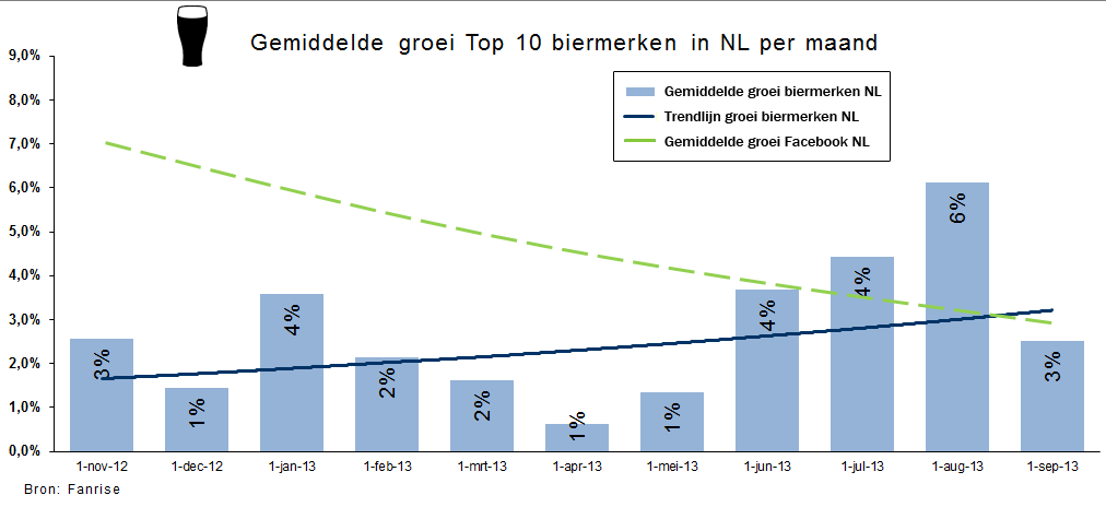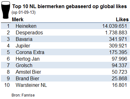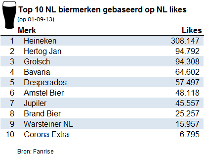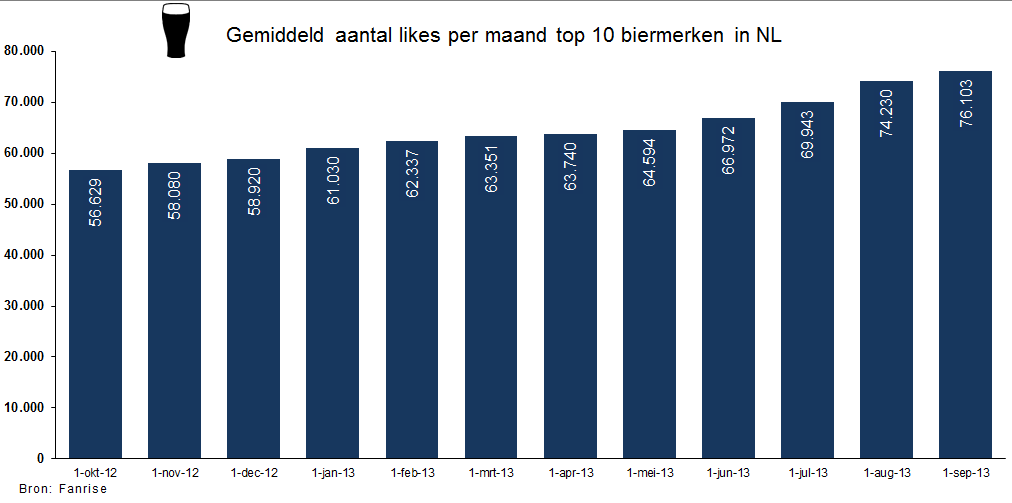 Het gemiddeld aantal likes van de top 10 biermerken in Nederland groeide van 56.629 op 1 oktober 2012 tot 76.103 op 1 september 2013, een groei van 34% in minder dan een jaar tijd.