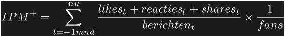 Hierbij worden de reacties, likes, shares en berichten van de afgelopen 30 dagen bij elkaar opgeteld en gedeeld door het aantal fans. IPM+ is een metric die je in staat stelt om pagina’s en berichten met elkaar te vergelijken op het gebied van interactie. Het is dan ook een goede methode om een benchmark tussen verschillende pagina’s uit te voeren. Iedereen kan de IPM+-score van zijn of haar eigen pagina gemakkelijk zelf uitrekenen met de IPM+-calculator.