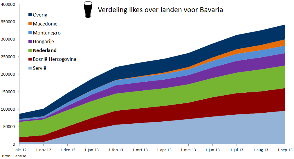 Bavaria wordt af en toe aangehaald als een van de grootste Nederlandse merken op Facebook. Dit omdat veel mensen verwachten dat de fans ook grotendeels uit Nederland komen. Dat is niet het geval. 19% van de fans van Bavaria komt uit Nederland. Interessant is te zien waar de vele duizenden likes (in totaal meer dan 350.000) dan nog meer vandaan komen, want ook dat is te achterhalen. Vooral uit Oost-Europa, zo blijkt: de fans van Bavaria komen voornamelijk uit Servië, Bosnië en Hongarije. Dit is te verklaren doordat Bavaria ook in deze landen actief is op social media.