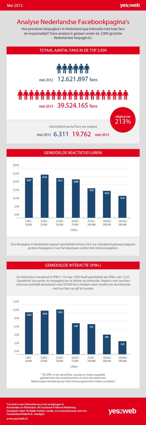 Hoe presteren fanpagina’s in Nederland qua interactie met haar fans en responsetijd? Dit leek ons bij Yes2web interessant om, net als vorig jaar, onder de loep te nemen. Hiervoor hebben we wederom gekeken naar de 2.000 grootste Nederlandse fanpagina's. Uit de analyse blijkt dat het gemiddeld aantal fans per pagina op 1 mei is gestegen naar 19.762 fans ten opzichte van 6.311 fans een jaar eerder. Een fanpagina in Nederland reageert gemiddeld binnen 24,3 uur. Grotere fanpagina’s reageren over het algemeen sneller dan kleinere pagina’s.