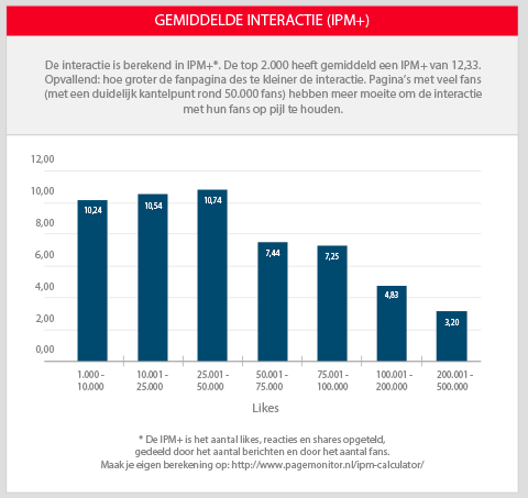 De interactie is berekend in IPM+ . De top 2.000 heeft gemiddeld een IPM+ van 12,33. Opvallend: hoe groter de fanpagina des te kleiner de interactie. Pagina’s met veel fans (met een duidelijk kantelpunt rond 50.000 fans) hebben meer moeite om de interactie met hun fans op pijl te houden.