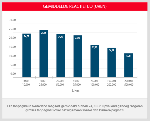Een fanpagina in Nederland reageert gemiddeld binnen 24,3 uur. Pagina's met meer dan 75.000 fans reageren gemiddeld sneller dan pagina's met minder dan 75.000 fans.
