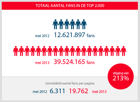 Totaal aantal fans top 2.000: 39.524.165 (mei 2013) vs. 12.621897 (mei 2012)