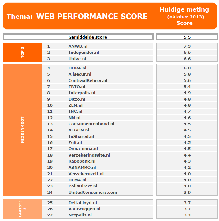 In april nam de top-3 van de ranglijst wat voorkeur betreft al 33,5 procent van de markt in. Zes maanden later zijn de ANWB, Independer en Univé samen zelfs goed voor 45,8 procent van de totale voorkeur. Independer heeft opnieuw het hoogste conversiepercentage: 35,2 procent, bijna gelijk aan dat van april (36,4 procent). Maar omdat ANWB.nl veel vaker wordt bezocht (70 tegen 45,5 procent), is het lagere conversiepercentage van 27,1 procent deze keer genoeg voor de overwinning.