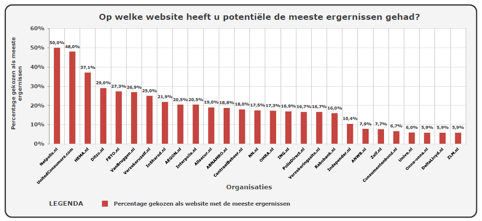 De gebruiksvriendelijkheid die beloofd werd bij de presentatie van de nieuwe websites schiet volgens opvallend veel bezoekers toch tekort. 29 procent van de bezoekers van Ditzo.nl geeft aan op deze website de meeste ergernissen te hebben beleefd. Bij FBTO.nl gaat het om 27,3 procent. Beide websites behoren daarmee tot de top-5 op dit gebied.