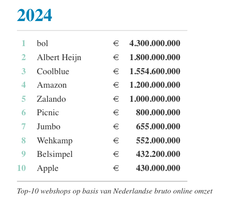 De top 10 grootste webshops in Nederland ziet er als volgt uit: