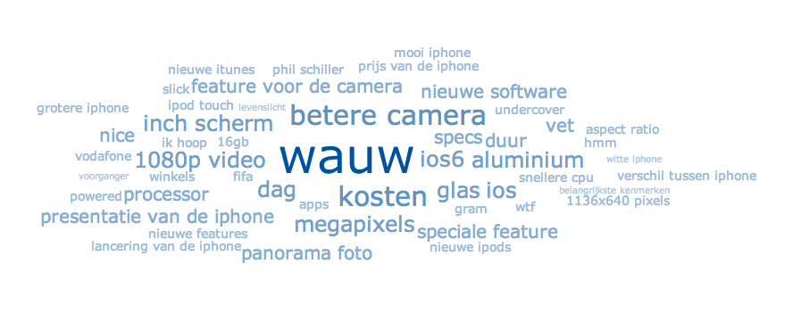 Ik kon het niet laten nog online via Coosto te checken wat de kernboodschap is die online is opgepakt in de eerste uren na de presentatie. Natuurlijk heeft niet iedereen de keynote zitten uitspitten zoals ik, maar er komt een aantal zaken naar voren. Opvallend is dat “de dunste telefoon” daar niet toe behoort. De meeste reacties zijn wel positief en er zijn rond de introductie ruim 40.000 berichten gedeeld. De PR-machine heeft zijn werk weer gedaan. Nu kijken of iPhone 5 weer een wereldhit word.
