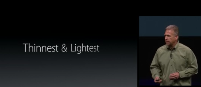 Tijdens het deel over iPhone 5 was de start van de introductie: Thinner, lighter design. Vervolgens werd het grotere scherm geïntroduceerd, snelheid van de processor en de nieuwe camera. Als klap op de vuurpijl: “The world most advanced operating system iOS 6”. En uiteindelijk ging men weer terug naar de gebruikerservaring en bleef men niet hangen in specificaties. Op het eind van de keynote komt CEO Tim Cook met een recap en daar werd nogmaals gezegd: “The worlds thinnest phone”.