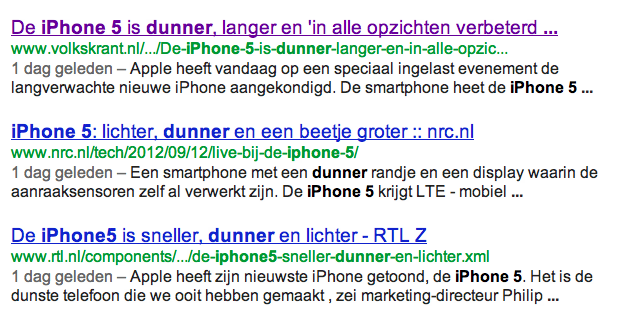 Online is de boodschap direct overgenomen, tik maar eens “iPhone 5 dunner” en je krijgt 19.900.000 hits in Google. Ter vergelijking: “Marketingfacts” levert 452.000 hits op. Berichtgeving vanuit het ANP (en door veel sites overgenomen) is de kernboodschap: dunner en lichter.