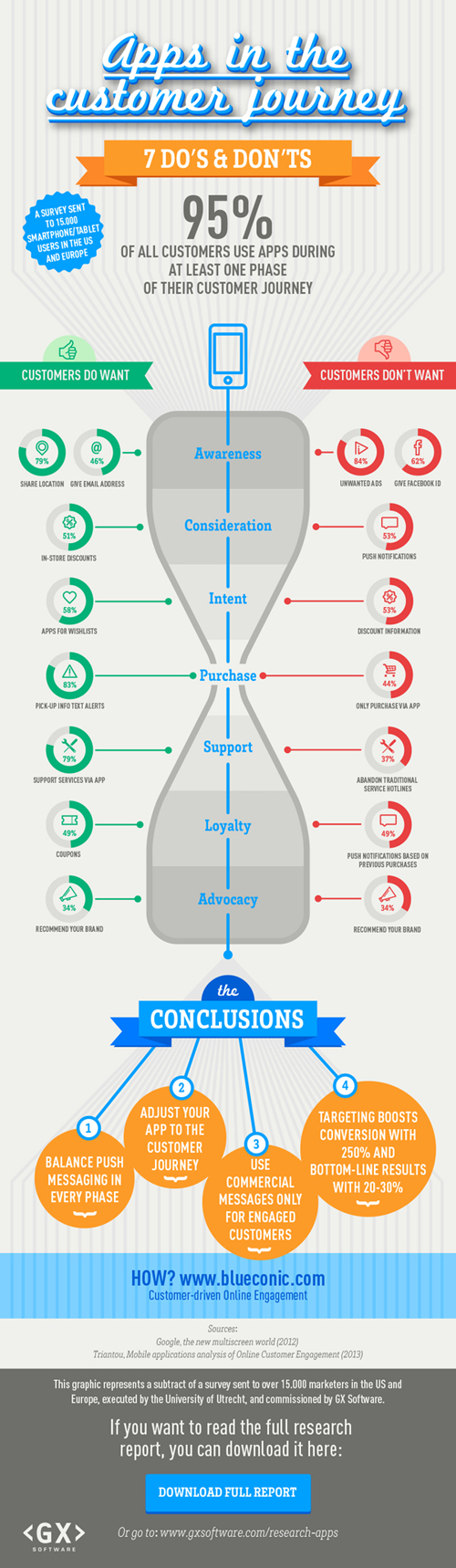 Apps zijn enorm populair, maar wat hebben we er eigenlijk aan als marketeers. Zijn apps slechts marketingspeelgoed of spelen ze een onmisbare rol in de marketingmix? Om daar achter te komen heeft de Universiteit van Utrecht in opdracht van GX Software onderzoek gedaan naar de rol die apps spelen in de customer journey. 95 procent van consumenten gebruiken apps bij of na een aankoop. Interessanter nog, consumenten stellen per fase van hun klantreis hele andere eisen aan apps. Welke? Bekijk de infographic hieronder.