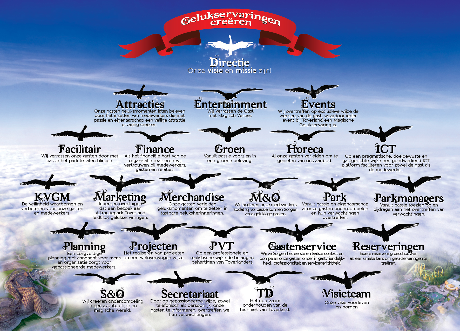 “We geloven in ganzenleiderschap: ganzen vliegen in een V-formatie. Zodra de voorste gans moe begint te worden, sluit deze achter aan en neemt een andere gans de koppositie over. Kortom: we doen dit met zijn allen, alle Toverlanders samen”, aldus Huijsmans. “We zijn als medewerkers continu bezig met het overtreffen van verwachtingen en het uitdragen van onze visie.