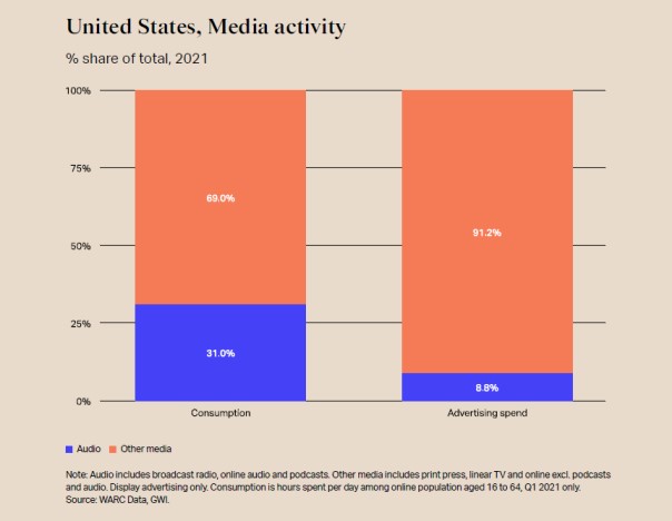 Consumenten, ongeacht de demografische generatie waartoe ze behoren, besteden steeds meer tijd aan audiocontent via radio, streaming en podcasts, waarschijnlijk omdat het gemak en de toegankelijkheid van audio toeneemt: de verspreiding van draadloze hoofdtelefoons, slimme luidsprekers, de multimediacomputer in je broekzak; het draagt allemaal bij aan méér luisteren in de auto, thuis en op het werk. Daardoor bestaat een enorme kans voor marketeers en adverteerders om mee te liften op de massale markt voor audioadverteren met groot bereik en hoge betrokkenheid.