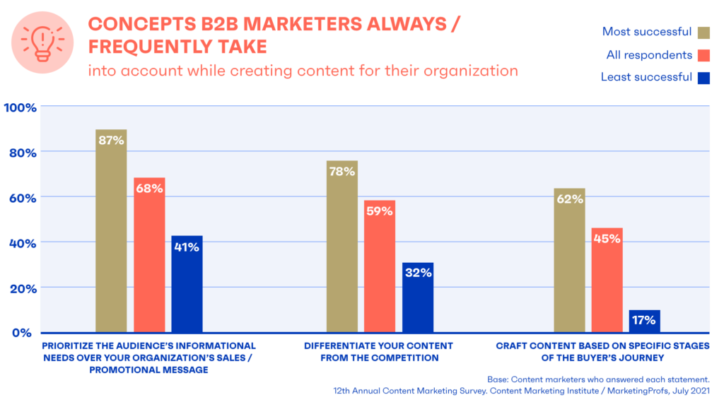 De jaarlijkse CMI Content Marketing-enquête voor 2022: “De meest succesvolle marketeers gaven prioriteit aan de informatiebehoeften van hun doelgroep, maakten onderscheidende content en maakten deze content op basis van de fases van het koopproces (de buyer’s journey).” Zie in de onderstaande grafiek: