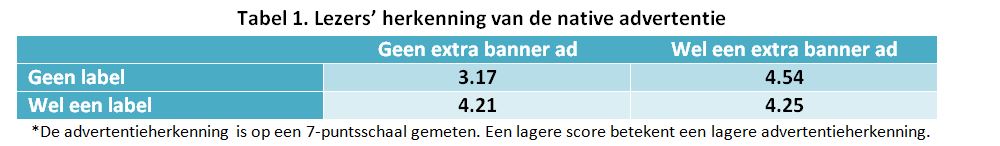 Lezers gaven op een zevenpuntsschaal aan in hoeverre ze het eens waren met de stelling: ‘Het artikel dat ik zojuist zag was een advertentie’ (1 = volledig oneens, 7 = volledig eens). De resultaten lieten zien dat zowel het toevoegen van een banner, als het zien van het label, voor een significant hogere advertentieherkenning zorgde. Het combineren van een banner met een label zorgde niet voor een extra hoge advertentieherkenning.