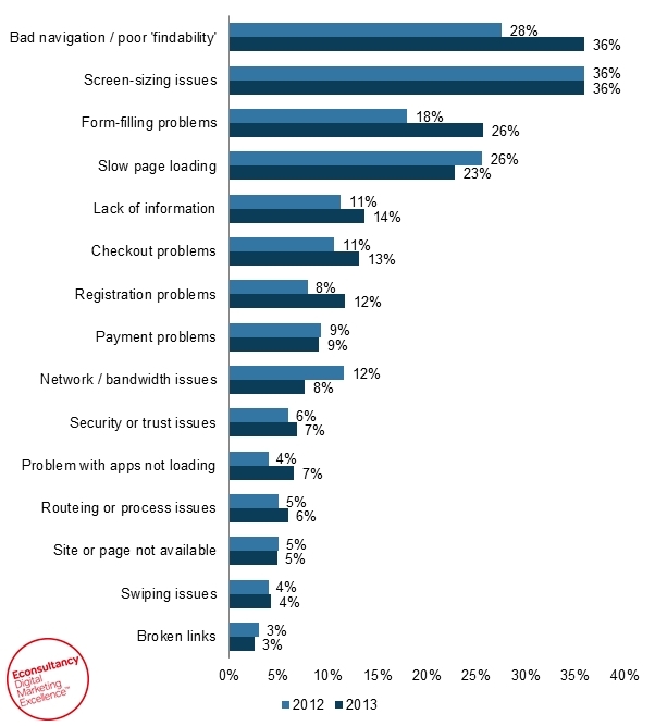 Vorige jaar kopten we nog dat slechte navigatie het belangrijkste usability-issue was voor mobiel. Het lijkt er op dat daar naar geluisterd is: waar vorig jaar nog 36 procent van de repondenten het als grootste issue noemde is dat dit jaar afgenomen tot 28 procent. Daarentegen is het invullen van formulieren op mobiel juist vaker genoemd als probleem (26 vs. 18 procent).