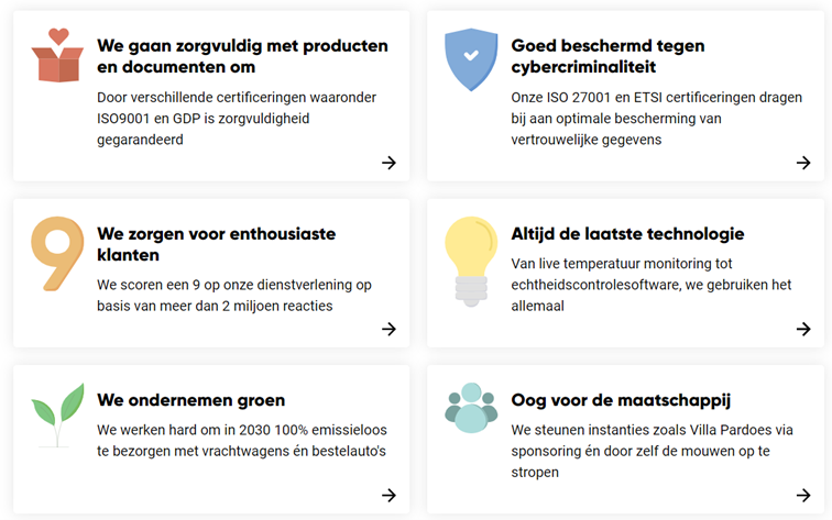 Voordat we uitleggen welke logistieke en identificatiediensten we hebben, beginnen we met uitleg over de zes beloftes. Zo vertellen we indirect ook over onze drijfveren en dat maakt een sterkere binding dan dat je gelijk begint over wat je doet.