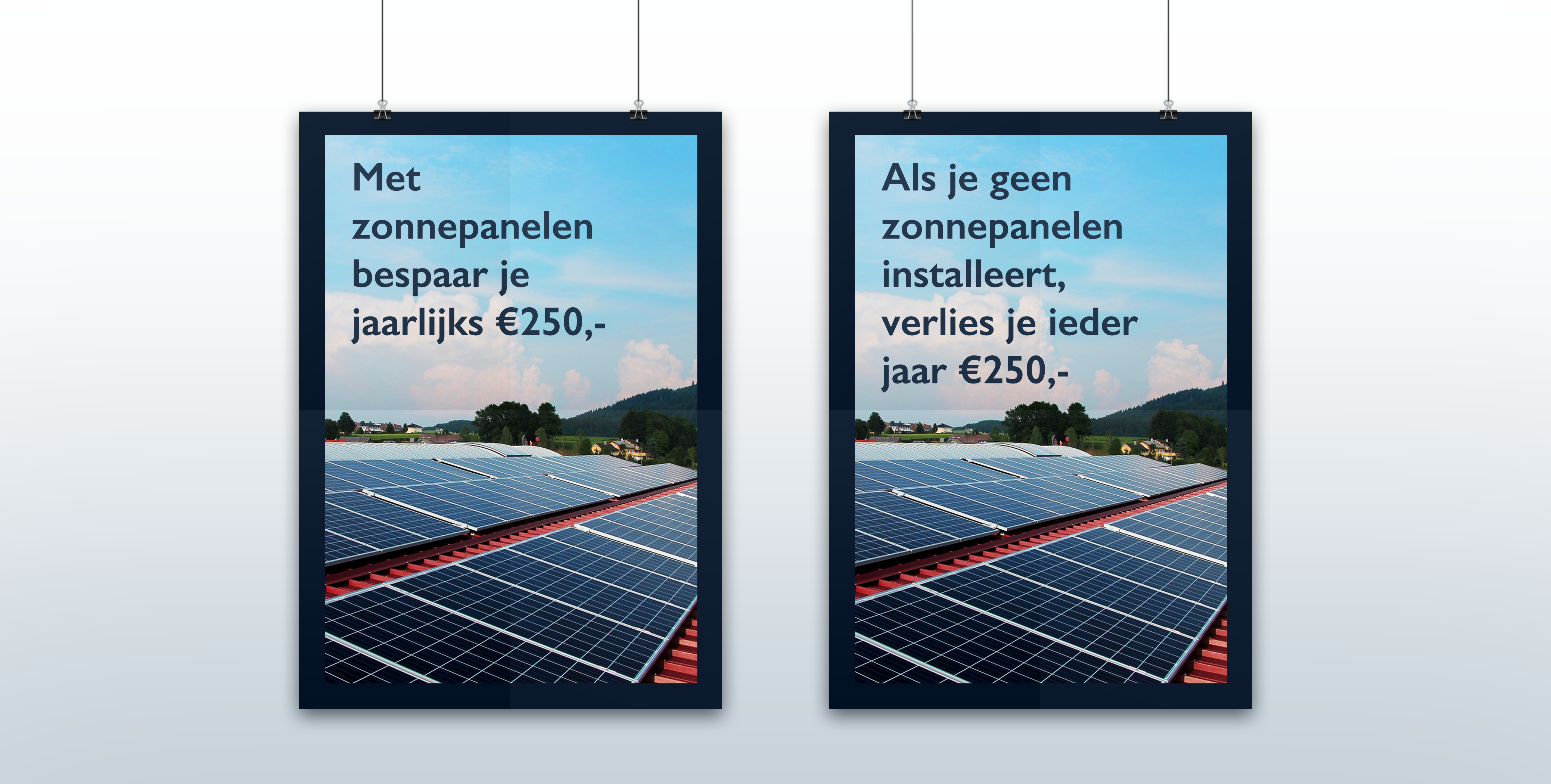 Dit principe kunnen we natuurlijk goed gebruiken om aandacht van mensen te trekken. Ter illustratie geeft Sue het volgende voorbeeld: je zou kunnen zeggen: “Met zonnepanelen bespaar je jaarlijks 250 euro”, maar je kunt ook zeggen: “Als je geen zonnepanelen installeert, verlies je ieder jaar 250 euro.” Interessant om ook op deze manier eens na te denken over en te spelen met het framen van de beloning.