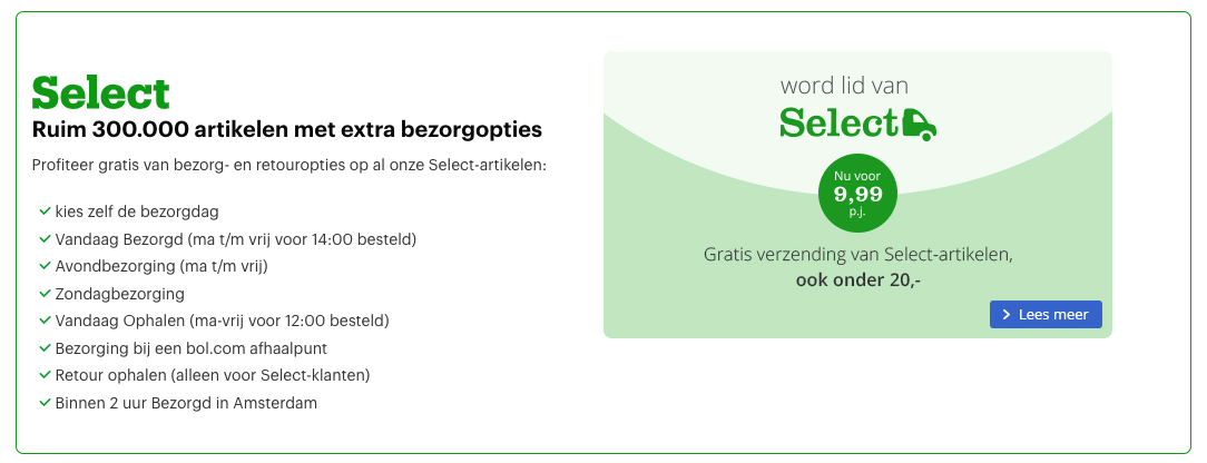 Bij beloningen denken we al snel aan het weggeven van iets extra’s of het geven van korting. Toch zien we vaker dat mensen onder het mom van Pay to Play bereid zijn om te betalen voor bepaalde extra’s, mits het aanbod interessant genoeg is. Neem bijvoorbeeld Bol.com Select, waarbij je voor slechts 9,99 euro per jaar al je aankopen kunt laten bezorgen of retourneren, zoals jij het wilt én op het moment dat jij het wilt.