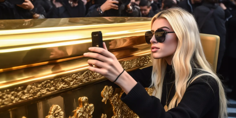 Tussen de verzamelde menigte spotten we opvallende figuren: influencers in hun meest opvallende outfits, smartphones in de aanslag. Ze zijn op zoek naar het perfecte beeld, een selfie met de met goud bedekte kist van Berlusconi, als herinnering aan deze historische dag.