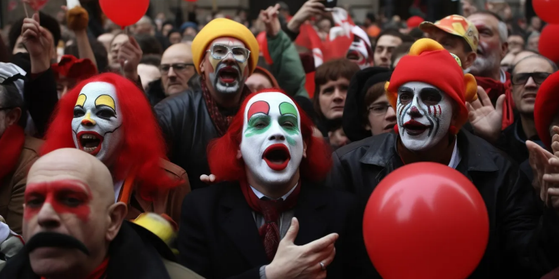 Niet iedereen rouwt echter op deze dag. Sommigen hebben ervoor gekozen om te vieren, de ‘goede fles’ open te trekken en te proosten op het leven. Een groep demonstranten in clownskostuums trekt de aandacht. Hun aanwezigheid en het daaropvolgende tumult veroorzaken verdeeldheid onder de aanwezigen.