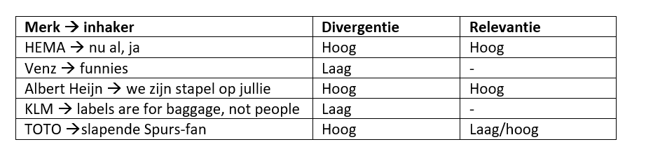 Het is dan eigenlijk een verrassing dat geen enkele inhaker inhaakt op een echt onverwacht moment. Alleen de inhaker van Hema wijkt hier enigszins van af: zij haken niet in op feestdagen, vakanties en grote landelijke evenementen, maar wel op een terugkerend thema. Opvallend is dat ze er zelf een ‘verwacht’ moment van maken door te zeggen: “nu al, ja” en daarmee verwijzen naar de jaarlijks terugkerende discussies over het te vroeg in de winkels liggen van pepernoten en paaseitjes. Met andere woorden, Hema lijkt dit terugkerend moment te claimen voor zichzelf. Op basis van dit kenmerk lijkt de inhaker van Hema dus de meeste kans te maken op de award.