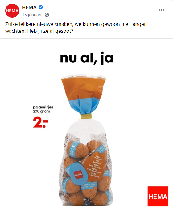 - Hema haakt met ‘Nu al, ja’, in op het gegeven dat de paaseitjes veel te vroeg in de winkel liggen en dat mensen daarover vallen.