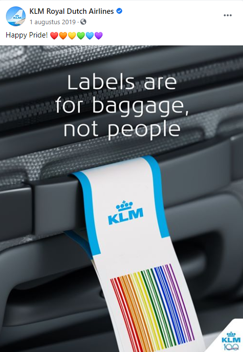 - KLM haakt met ‘Labels are for baggage, not people’ en een foto met een bagagelabel met een streepjescode in regenboogkleuren in op Pride Amsterdam.
