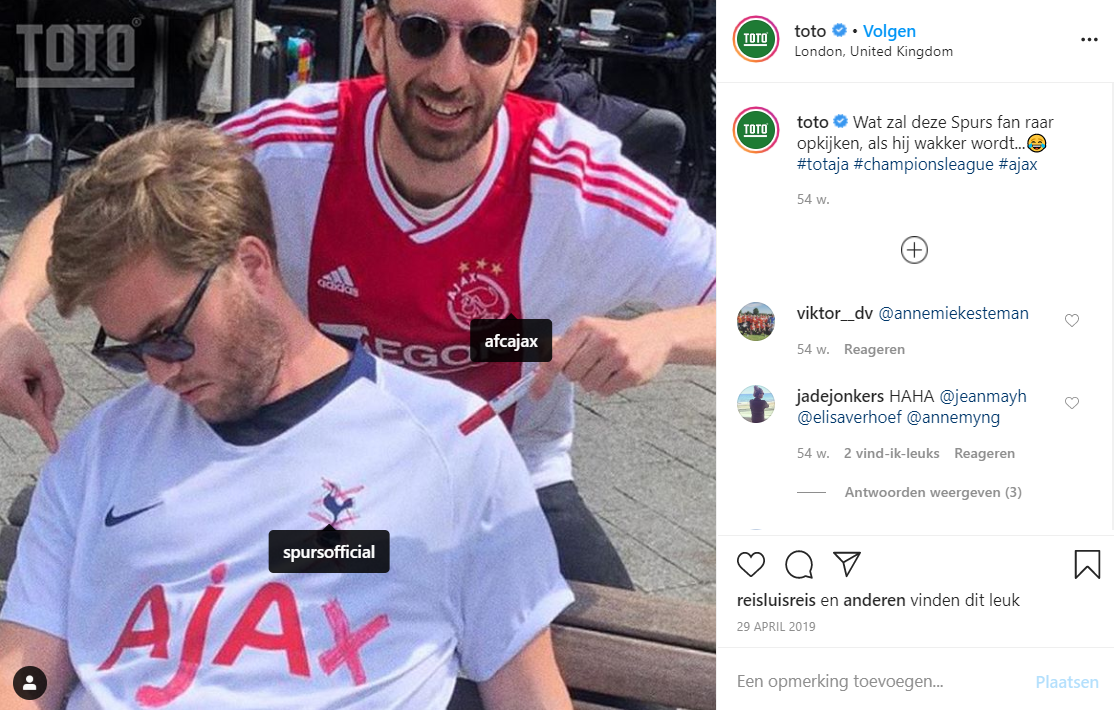 - Toto, als legale aanbieder van sportweddenschappen, past als merk bij een Champions League-wedstrijd. Toch is het niet direct duidelijk dat Toto het merk achter deze inhaker is, omdat de foto een slapende Spurs-fan toont, waarvan het T-shirt van AIA is veranderd in Ajax, door een Ajax-fan. Alleen de plaatsing van de Instagramfoto op het account van Toto verraadt dat dit merk erachter zit. Als je het merk achter de foto niet (her)kent en verwacht dat een fan achter de foto zit, zijn de merken die op de foto getoond worden ook congruent aan het moment: Ajax, Tottenham-Hotspurs en AIA, de hoofdsponsor van de club.