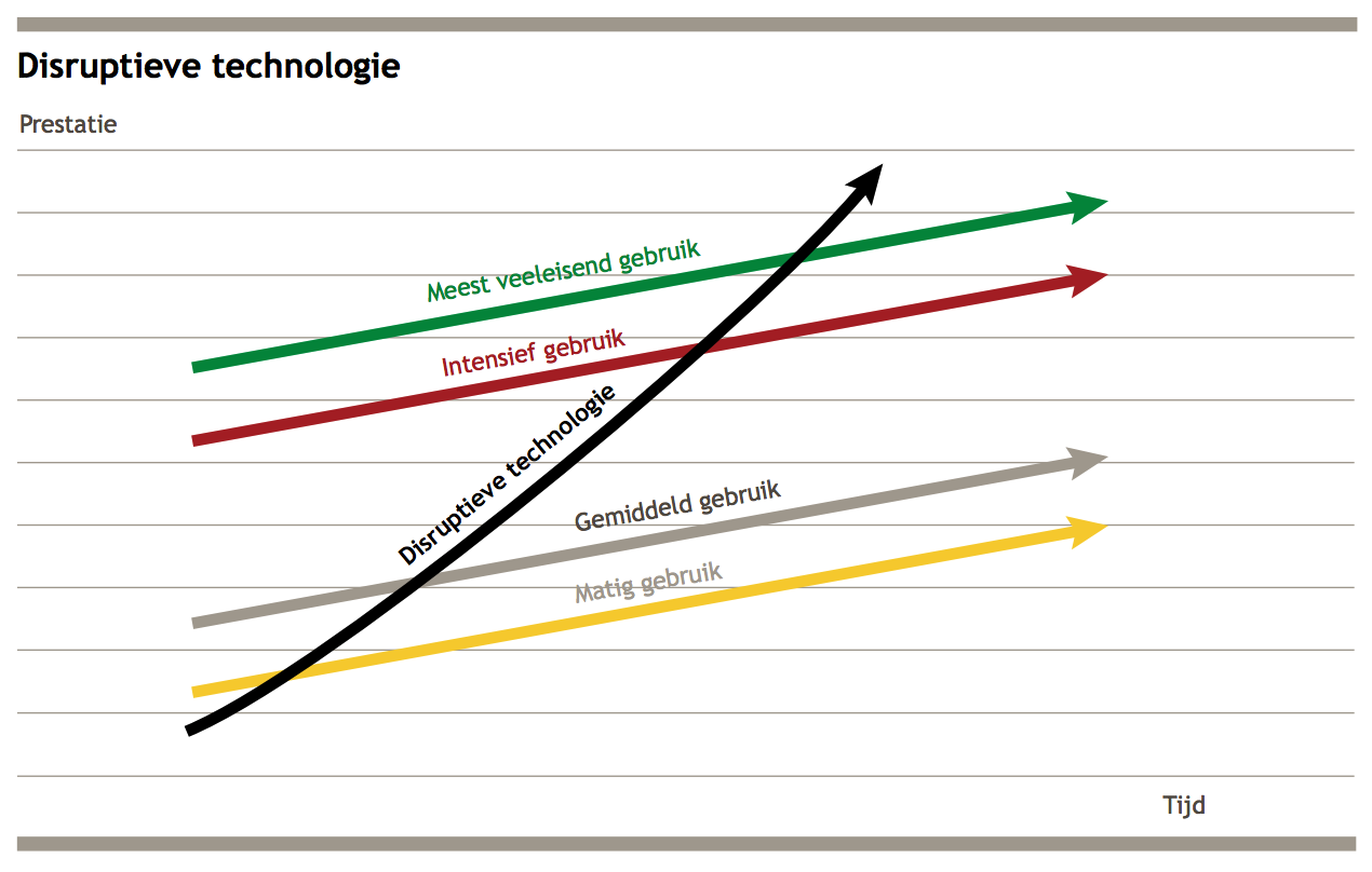 Disruptie is daarmee een voorspelbaar patroon in sectoren waar beginnende bedrijven nieuwe technologie gebruiken om goedkopere en inferieure alternatieven te bieden voor producten van gevestigde spelers in de markt (denk aan Toyota dat enkele decennia geleden de strijd aanging met Detroit). Door de jaren heen is dit gedachtegoed, waaraan inmiddels een hele bibliotheek is gewijd, algemeen bewierookt. Momenteel luidt de ondertitel dan ook: “The Revolutionary Book that Will Transform the Way You Do Business”.