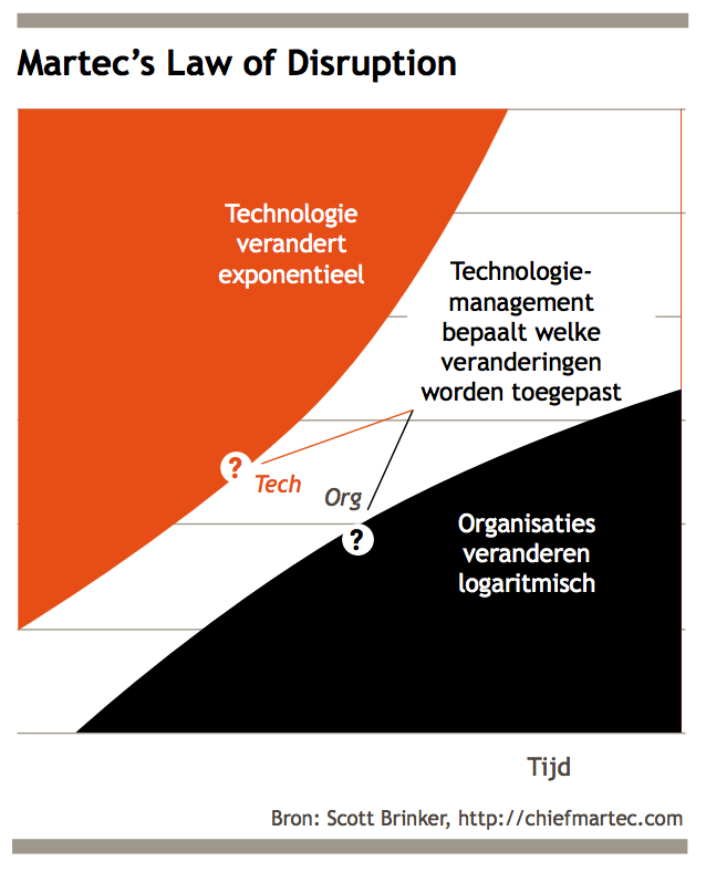De ontwrichtingswet van Martec, die vernoemd is naar het weblog van marketingtechnoloog Scott Brinker, toont aan dat bedrijven zich minder snel ontwikkelen dan technologie doet. De exponentiële groei die technologie doormaakt is een directe afgeleide van de Wet van Moore, die voorspelt dat de capaciteit van computers elke anderhalf jaar zal verdubbelen bij gelijkblijvende kosten. Organisaties daarentegen veranderen maar langzaam. Deze groeicurve is door een groep onderzoekers in een artikel in Nature ‘Eroom’s Law’ genoemd: het is Moore’s Law maar dan achterstevoren.