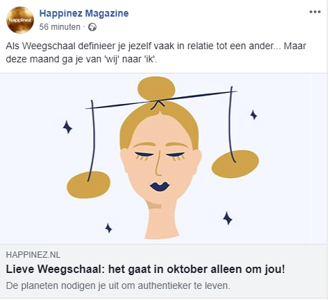 Het tijdschrift Happinez geeft bijvoorbeeld elke maand gehoor aan haar thema ‘Spiritualiteit’ door op Facebook de horoscopen van die maand te presenteren. Elke dag posten ze een nieuwe horoscoop-update, totdat alle horoscopen voorbij zijn gekomen. Content die aansluit bij wat de doelgroep van Happinez verwacht van het tijdschrift, en waar Happinez dan ook structureel gehoor aan geeft.