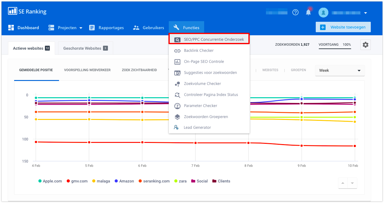 SE Ranking is een zeer gebruiksvriendelijk alles-in-één SEO-platform dat je helpt bij het uitvoeren van allerlei website-optimalisatietaken, en het beste is dat het volledig beschikbaar is in het Nederlands. De service is vooral bekend om zijn hulpprogramma voor het rangschikken van zoekwoorden, maar het heeft ook andere krachtige hulpprogramma’s die je helpen bij het zoeken naar zoekwoorden, concurrentieanalyses, zoekwoordsuggesties, auditwebsites, backlinks controleren en nog veel meer.