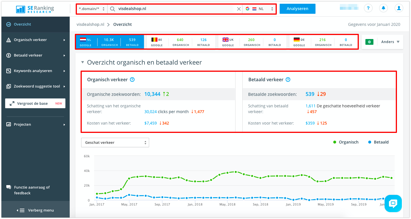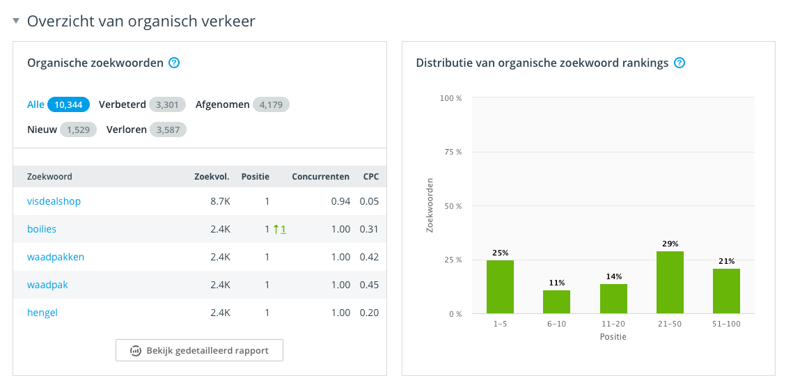 Hier zijn enkele gegevens die laten zien hoeveel trefwoorden werden gevonden in elke tool voor Visdealshop.nl bij organisch en betaald zoeken: