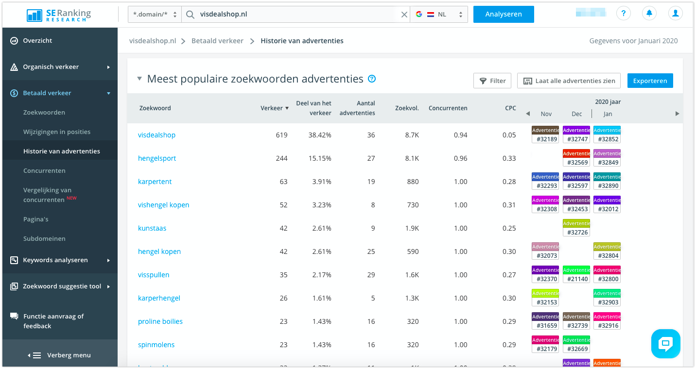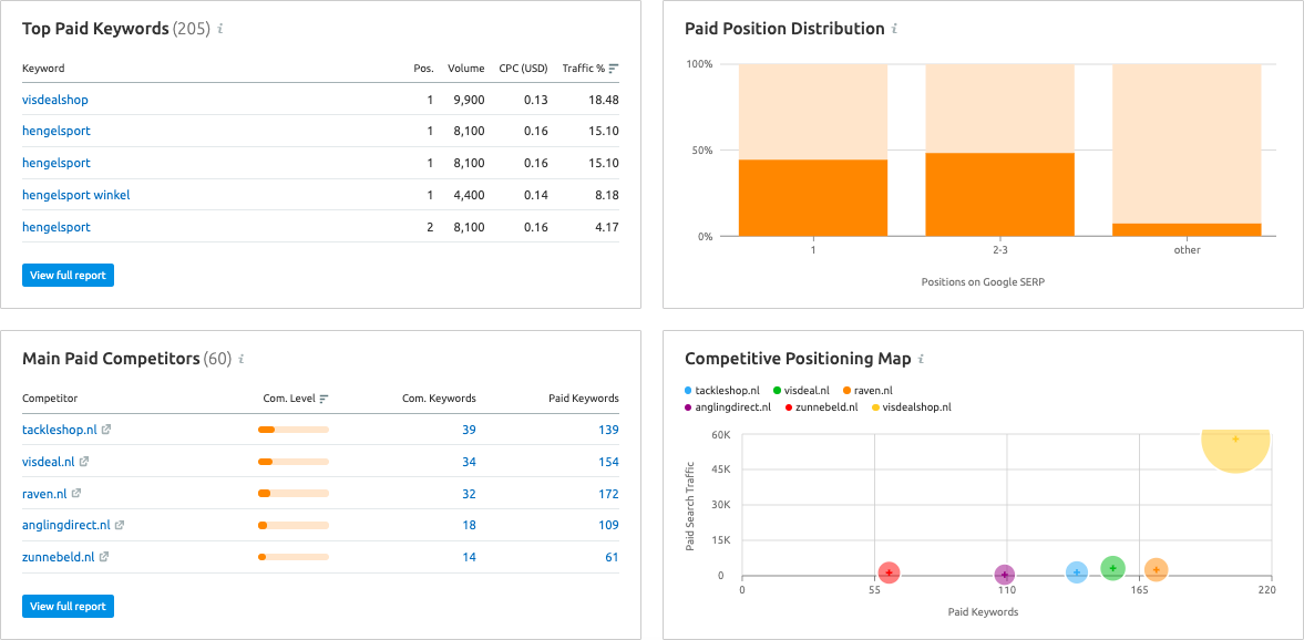 Verderop krijg je dezelfde gegevens over betaald verkeer. En helemaal onderaan de pagina vind je de meest populaire advertenties die door het geanalyseerde domein worden weergegeven op Google Ads. Naast het overzicht biedt SE Ranking je de mogelijkheid om gedetailleerde gegevens te krijgen over de organische en betaalde campagnes van je concurrent. Ontdek alles over hoe de organische en betaalde rankings van je concurrent in de loop van de tijd zijn veranderd, ontdek extra concurrenten op basis van zoekwoorden en vergelijk ze, plus ontdek welke pagina’s en subdomeinen het meest succesvol zijn.