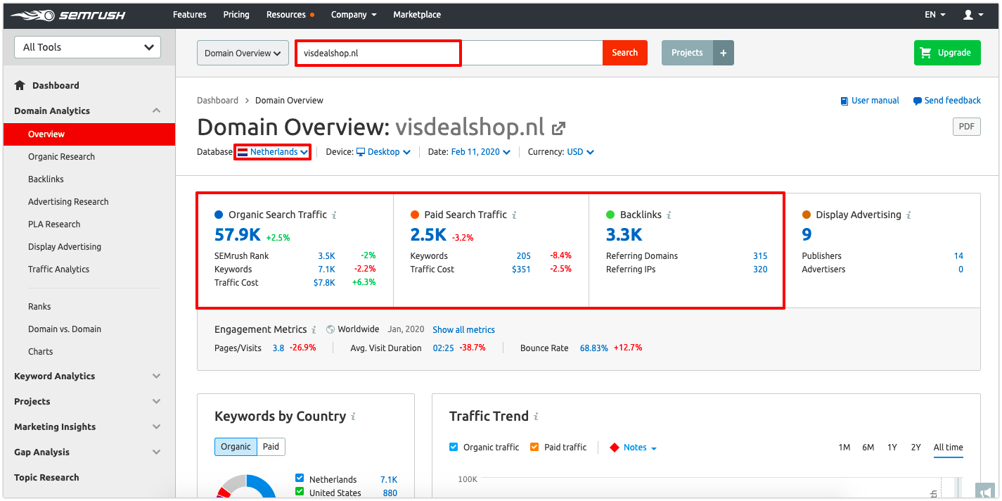 Zoals je ziet, toont het domeinoverzicht van SEMrush de volgende informatie: