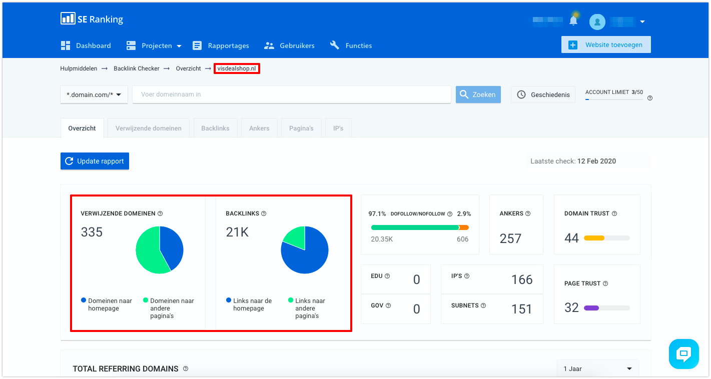 Als een resultaat heeft SE Ranking in totaal 335 verwijzende domeinen gevonden. SEMrush vond 315, terwijl Ahrefs slechts 199 vond. Als het gaat om het totale aantal backlinks, vond SE Ranking 21.000, SEMrush 3.300 en Ahrefs 5.500.