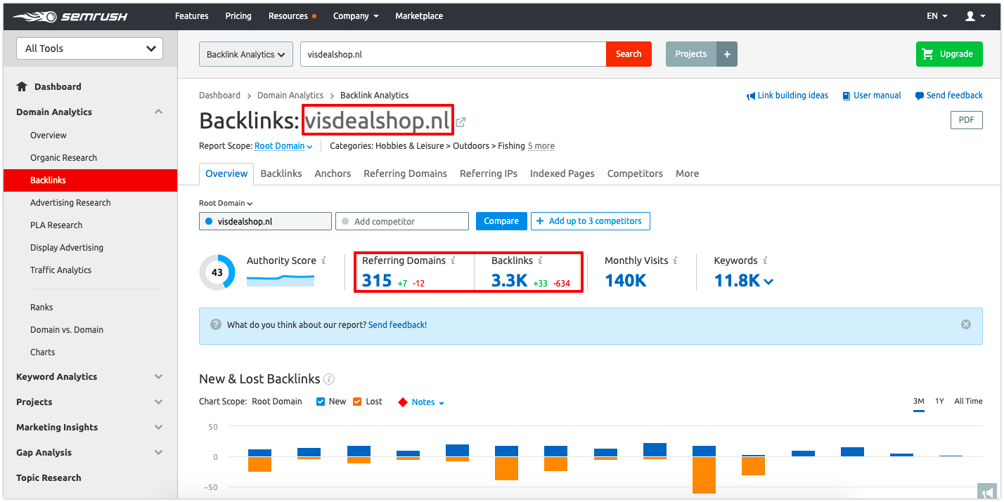 SEMrush is een andere grote speler op de markt van SEO-tools, maar is helaas vrij duur en niet beschikbaar in het Nederlands. De service biedt een allround-analyse van concurrenten, waaronder een domeinanalyse, trefwoordonderzoek en backlinks checker.