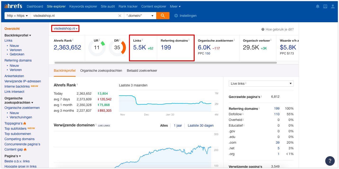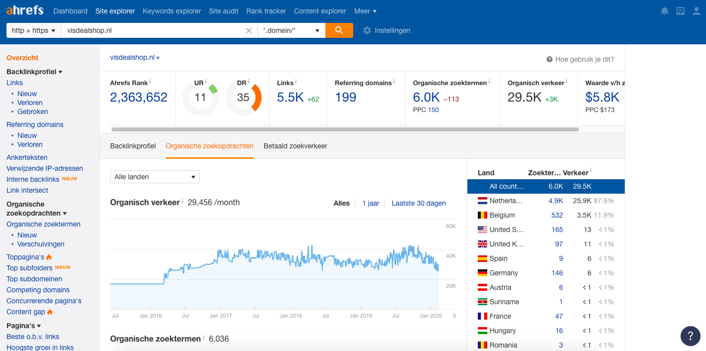 Ga naar Site Explorer, voer het domein in dat je wilt analyseren en kies vervolgens het land van zoekopdracht. Laten we hetzelfde voorbeeld nemen van Visdealshop.nl. Zo ziet het gedetailleerde overzicht van het domein eruit: