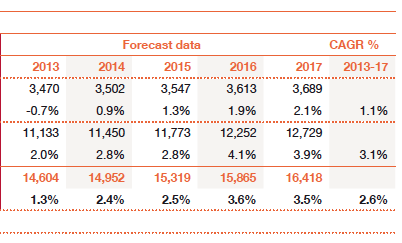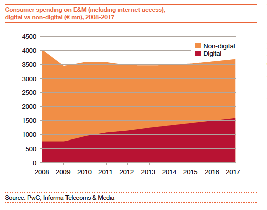 De totale bestedingen in de Nederlandse entertainment & mediasector bedroegen vorig jaar 14,4 miljard euro. De bestedingen zullen naar verwachting jaarlijks met gemiddeld 2,6 procent groeien naar 16,4 miljard euro in 2017. Dit bedrag is een optelsom van consumentenuitgaven en bestedingen aan advertenties. De advertentiemarkt daalde in 2012 met 2,3 procent, terwijl consumentenuitgaven aan entertainment en media nagenoeg gelijk bleven. Volgens Ennèl van Eeden, mediaspecialist bij PwC, zijn de magere cijfers in de sector een weerslag van de economische realiteit.
