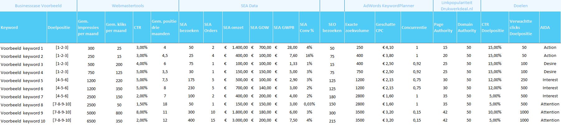 Bij de conversie van keywords houdt Drukwerkdeal.nl rekening met onder andere doelposities, AIDA-fases, te verwachten ‘clicks’ en uiteraard de financiële opbrengst (klik voor grotere weergave)