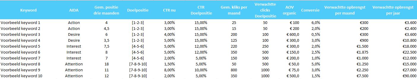 Voor de ROI Analyse hebben we een voorspelling gemaakt van de opbrengsten per zoekwoord. Dit hebben we gedaan op basis van het verwachtte aantal klikken bij bereiken van de doelpositie, de gemiddelde CTR en vervolgens de gem. orderwaarde en het conversiepercentage van de bestemmingspagina. Deze waarden samen komen tot een verwachtte opbrengst per zoekwoord.
