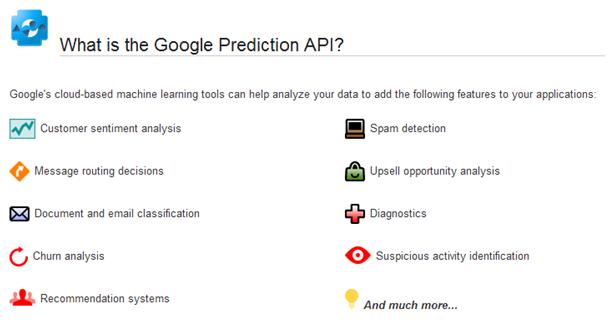 Met de Google Prediction API krijg je toegang tot Googles machine learning-algoritmes voor het voorspellen van toekomstscenario’s. Er zijn eindeloos veel toepassingen te bedenken, maar voor het gemak heeft Google er alvast een aantal op een rijtje gezet, waarbij met name de linkerkant van het rijtje interessant is voor marketing intelligence.