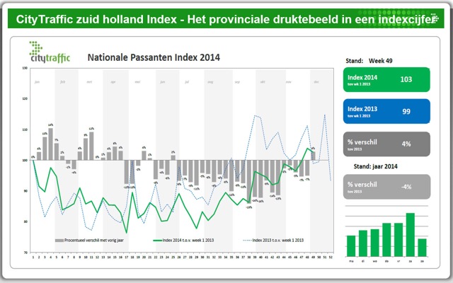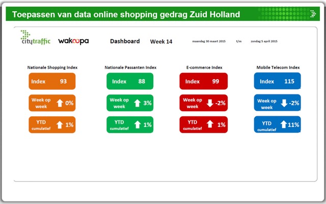 Na het berekenen van de capture rate is een realistisch beeld ontstaan over de verhouding passanten en aantal bezoekers in de winkel. Deze cijfers kun je vervolgens vergelijken met het online surfgedrag in diezelfde periode, waardoor je inzicht krijgt in het on- en offline winkelgedrag gedurende de looptijd van de (crossmediale) campagne. Deze ‘shopping index’ is een weergave van het actuele on- en offline winkelgedrag in Nederland. De passantenaantallen in winkelstraten zijn uitgesplitst naar regio en weekdag. De index van het online winkelgedrag kan bovendien verder worden uitgesplitst per branche, zodat je naast het algemene online shoppinggedrag ook in kunt zoomen op specifieke branches.